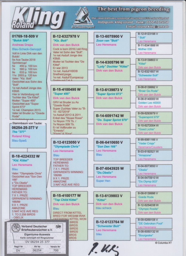 Uit: ”Bulck 509”, uit klz. ”Kittel”, 1. Nat. Asduif Sprint KBDB, lijn ”Bolt”, legende bij Leo Heremans x ”Kld. Kittel”, uit dochter ”Kittel”, 1. Nat. Asduif Sprint KBDB, lijn ”Olympiade 003”, Olympiade Cat. Snelheid bij Leo Heremans