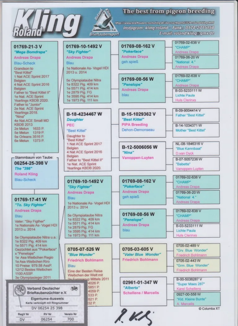 Uit: ”Mega Bomdrapa”, zoon ”Sky Fighter”, 1. Nat. Asduif, uit dochter ”Best Kittel”, 1. & 4. Nat. Asduif Sprint KBDB & vader 1. & 2. Nat. Asduif Sprint KBDB x ”To. Sky Fighter”, dochter ”Sky Fighter”, 1. Nat. Asduif Duitsland