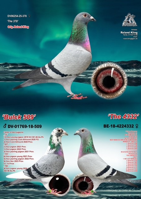 Uit: ”Bulck 509”, uit klz. ”Kittel”, 1. Nat. Asduif Sprint KBDB, lijn ”Bolt”, legende bij Leo Heremans x ”Kld. Kittel”, uit dochter ”Kittel”, 1. Nat. Asduif Sprint KBDB, lijn ”Olympiade 003”, Olympiade Cat. Snelheid bij Leo Heremans