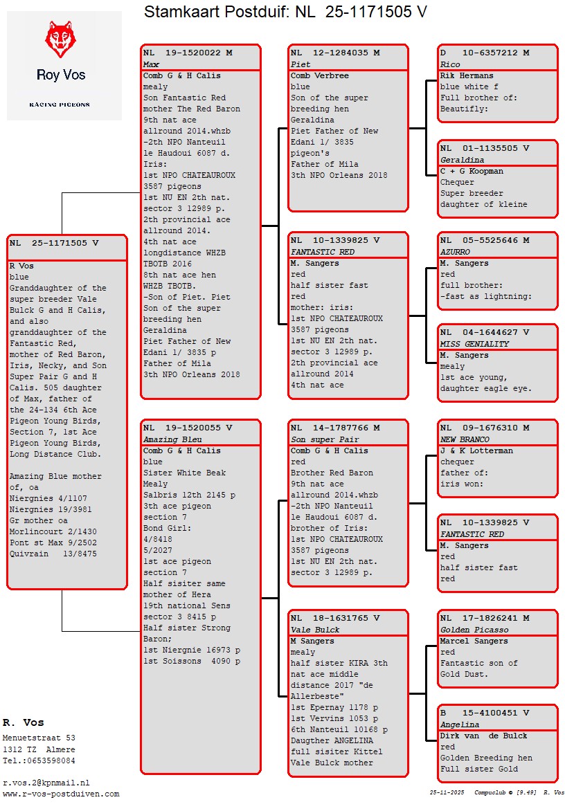 Kleindochter van de superkweker Vale Bulck G en H Calis, en ook kleindochter van de Fantastic Red, moeder van Red Baron, Iris, Necky, en Zoon Super Koppel G en H Calis. 505 dochter van Max, vader van de 24-134 6e Asduif Jonge Duiven, Afdeling 7, 1e Asduif Jonge Duiven, Zware Fond Club. Amazing Blue moeder van, o.a. Niergnies 4/1107 Niergnies 19/3981 Gr. moeder o.a. Morlincourt 2/1430 Pont st Max 9/2502 Quievrain 13/8475