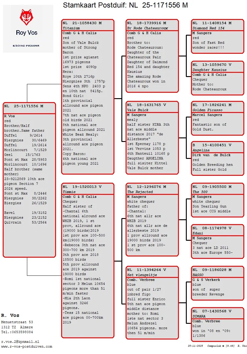 ”De 556”, 19.-3.182 d., 23.-2.152 d., 53.-2.564 d., 1/2 broer 7.-1.529 d., 8.-2.446 d., 9.-2.614 d., 10. Asduif Afd. 7 Jonge, uit: ”Titanium”, Superkweker & zoon ”Vale Bulck” x ”Timmie”, dochter ”The Rejected” & ”Het Vleugeltje”