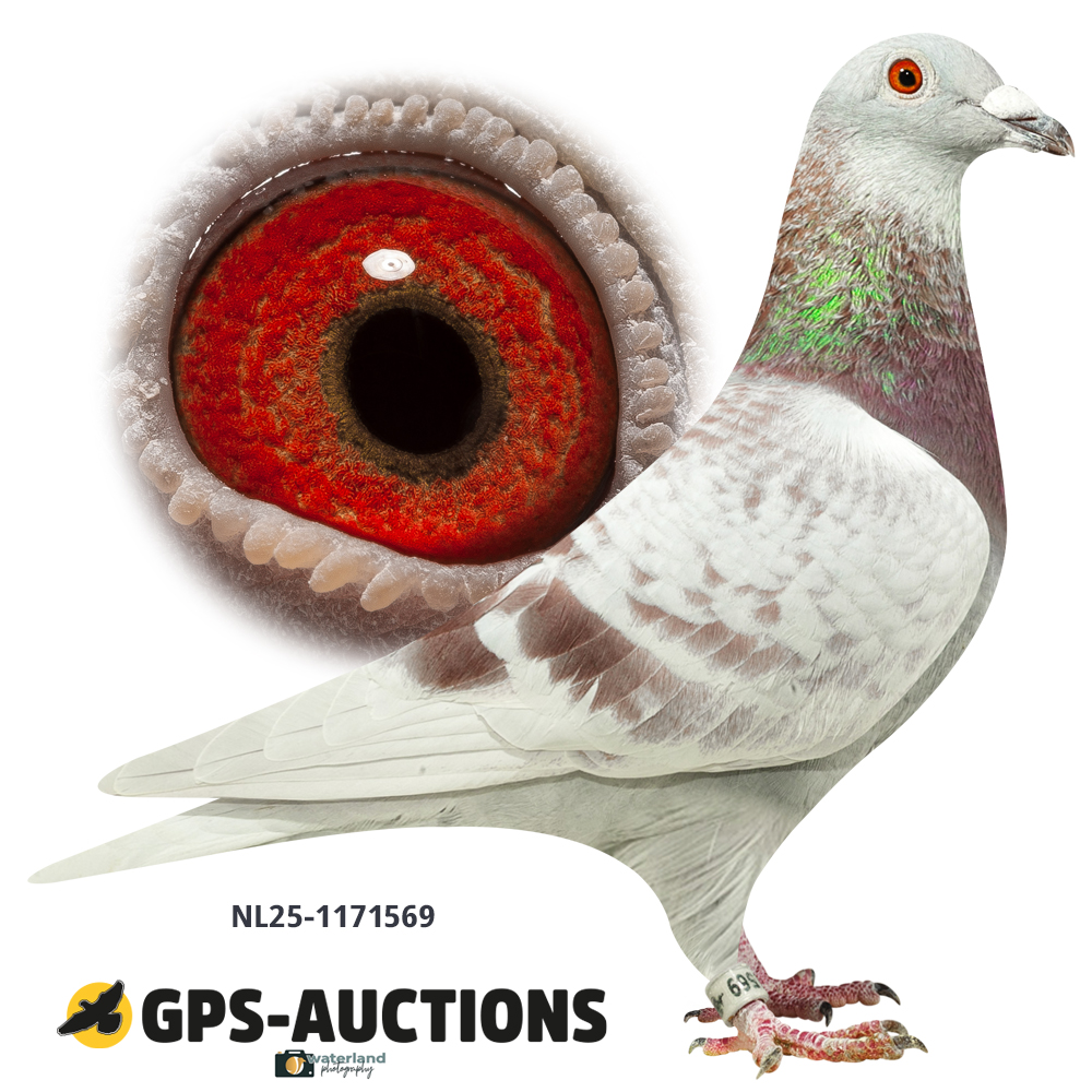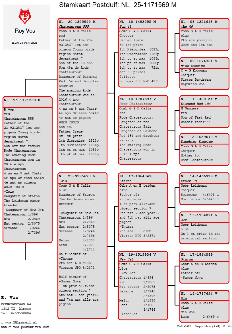 ”De 569”, 1/2 broer 1. Prov. Noord Asduif Jonge Duiven, uit: ”Chateauroux 555”, zoon ”Rode Chateauroux” x ”Isis”, 75% Gebr. Leideman, dtr. unieke kweker ”Staron” & ”New Jet”, 1.-3.246 d., 1.-1.338 d., 1.-896 d., 1.-700 d.