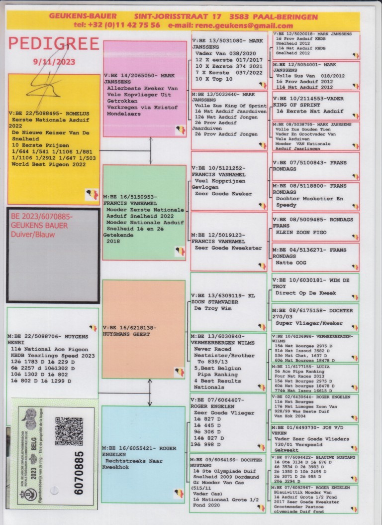 Uit: ”Romulus”, 1. Nat. Asduif Sprint KBDB, 1. Nat. Asduif FCI World Best Sprint, 10x 1. prijs, 1.-2.912 d., 1.-1.106 d., 1.-1.106d, etc. x ”The 706″, 11. Nat. Asduif KBDB, 1.-229d., 1.-802d., 1.-1.299d., 6.-2.257d., 10.-1.302d., bij Henri Huygens !!!!!!!!!!!!!!