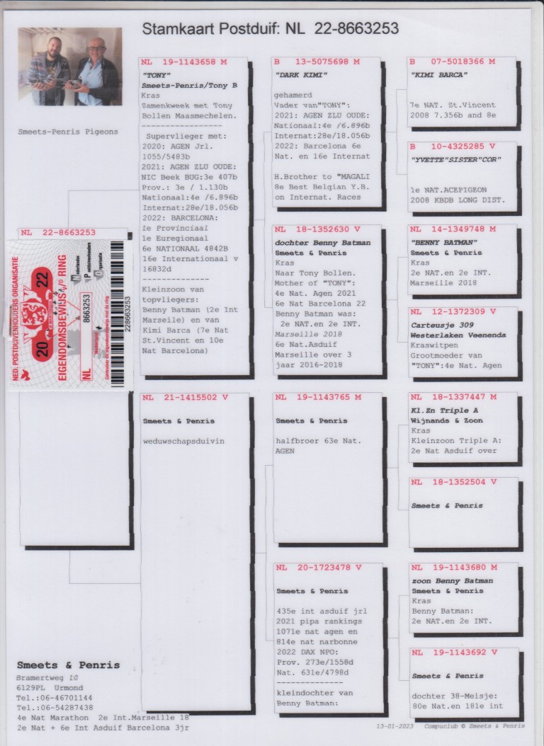 Uit: ”Tony”, 1. Prov. Barcelona, 3. Prov. Agen, 4. Nat. Agen 6.896 d., 6. Nat. Barcelona 4.842 d., 16. Int. Barcelona 16.832 d., 28. Int. Agen 18.056 d., uit dochter ”Benny Batman” x ”De 502”, uit 1/2 broer 63. Nat. Agen