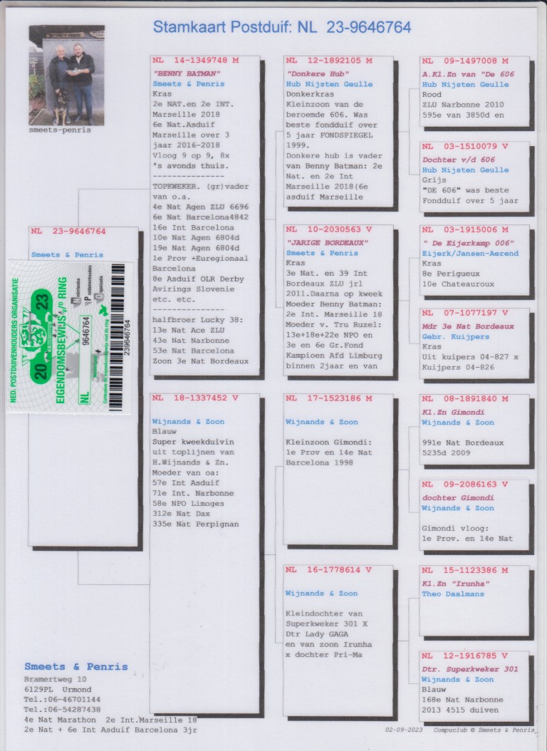 Uit: ”Benny Batman”, 2. Int. Marseille, 6. Nat. Asduif Marseille 2016/2018, (Gr) vader 1. Int. Asduif Int. Vluchten, 2. Nat. Marseille, 4. Nat. Agen, 6. Nat. Barcelona, 10. Nat. Agen, 15. Nat. Agen x ”De 452”, H. Wijnands & Zn.