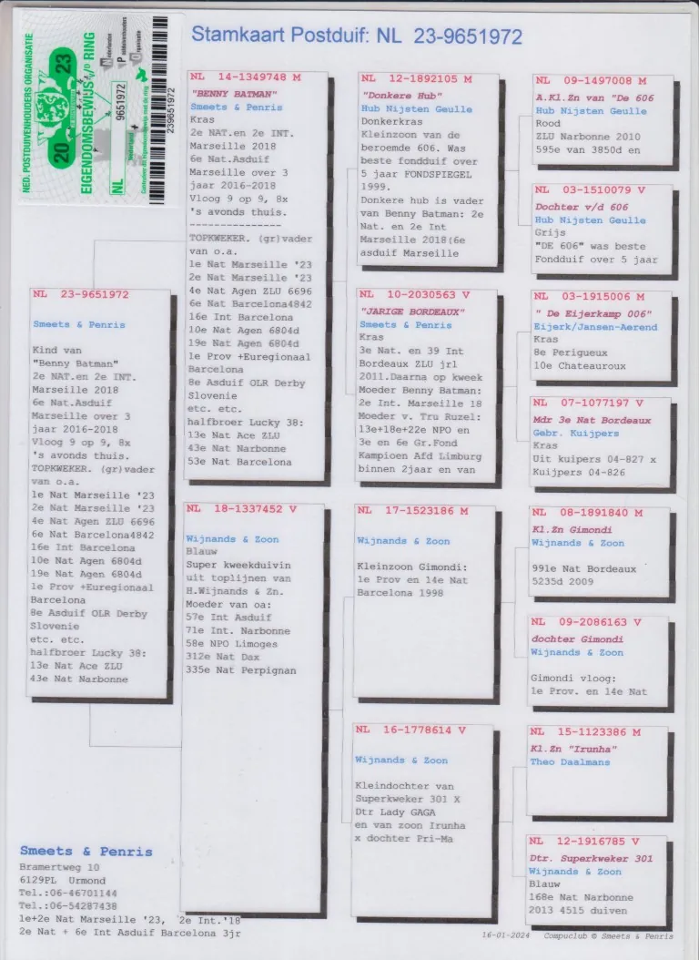 Uit: ”Benny Batman”, 2. Int. Marseille, 6. Nat. Asduif Marseille 2016/2018, (Gr) vader 1. Int. Asduif Int. Vluchten, 2. Nat. Marseille, 4. Nat. Agen, 6. Nat. Barcelona, 10. Nat. Agen, 15. Nat. Agen x ”De 452”, H. Wijnands & Zn.