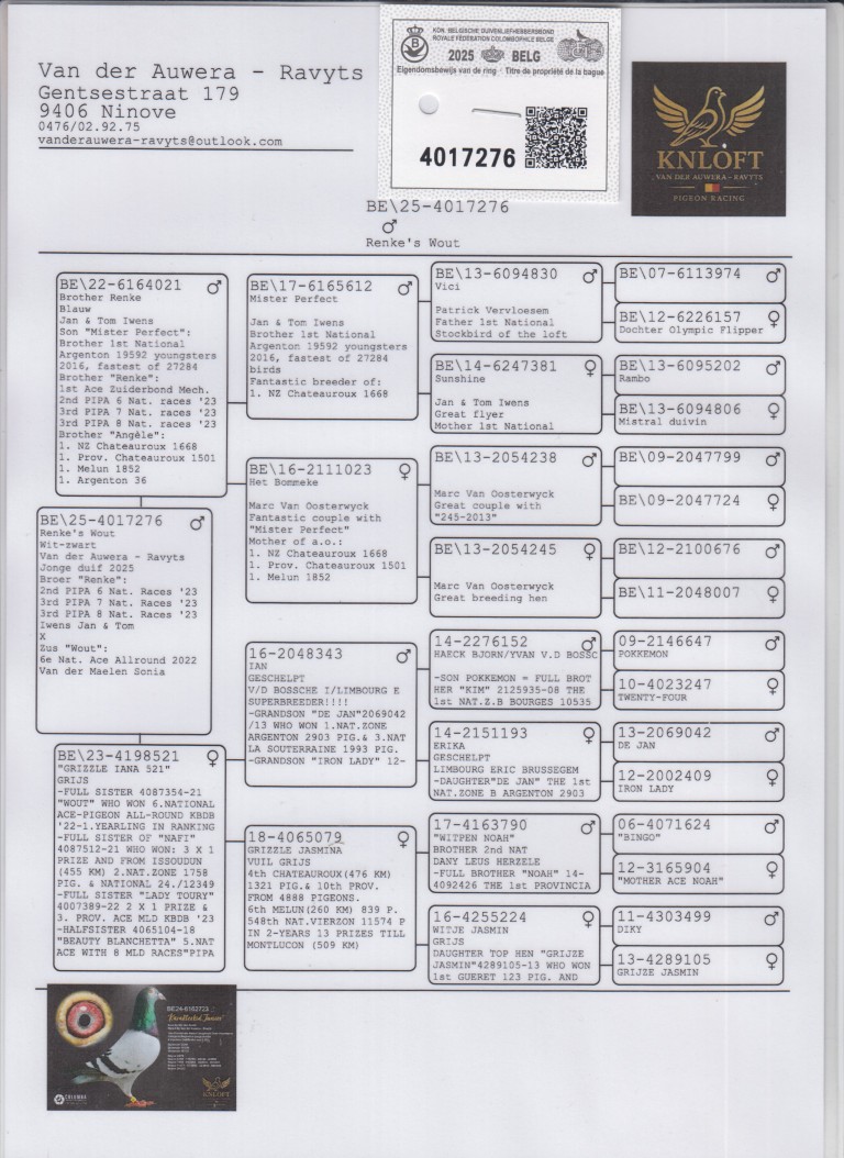 Uit: ”Brother Renke”, broer 1. Nat. Argenton 27.284 d., 1. Nat. Zone Chateauroux 1.668 d., 1. Prov. Chateauroux 1.501 d., 2.-3.-3.-3. Nat. Asduif Nat. Vluchten x ”Grizzle Iana”, zus ”Wout”, 6. Nat. Asduif KBDB