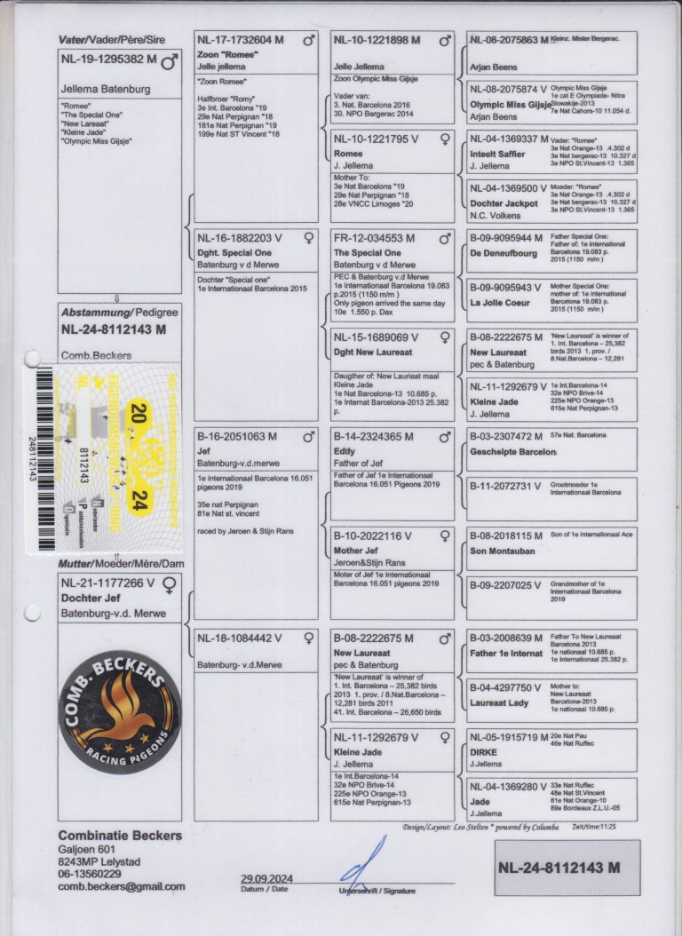 Uit: ”De 382”, uit zoon ”Romee”, Olympiade duif, uit dochter ”Special One”, 1. Int. Barcelona x ”Dochter Jef”, dochter ”Jef”, 1. Int. Barcelona (90 min. vooruit), uit dochter ”New Laureaat” & ”Kleine Jade”, 1. Int. Barcelona