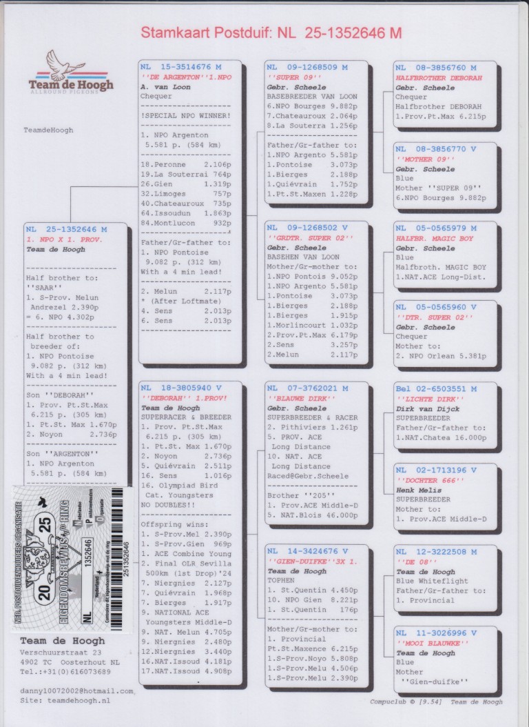 Uit: ”De Argenton”, 1. NPO Argenton 5.581 d., gr-vader 1. NPO Pontoise 9.082 d. x ”Deborah”, 1. Prov. 6.215 d., 1.-1.670 d., 2.-2.736 d., 5.-2.511 d., nazaten winnen 1.-2.390 d., 1. Asduif Jonge Rayon, 2. Finale OLR, 9. Nat. Asduif