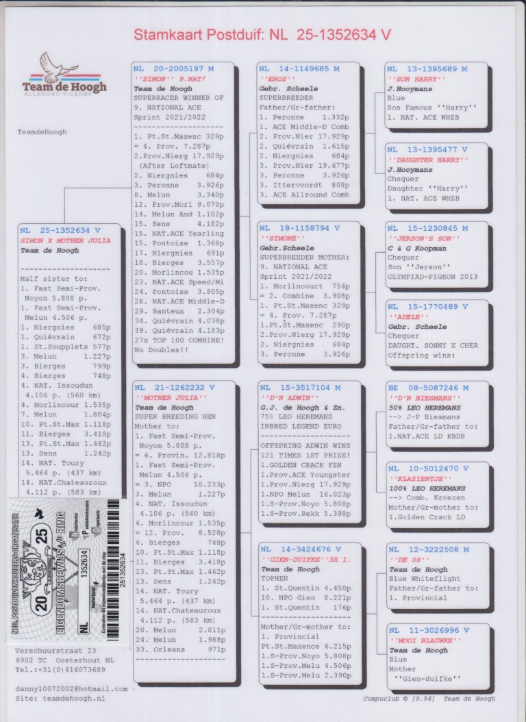 Uit: ”Simon”, 9. Nat. Asduif, 2. Prov. 17.929 d., 3.-3.926 d., 4. Prov. 7.287 d., 27x top 100 Rayon, vader 3x 1. Prijs x ”Mother Julia”, moeder 1.-5.808 d., 1.-4.506 d., 3.-1.227 d., 4. Nat. Issoudun 4.106 d., dochter ”Adwin”