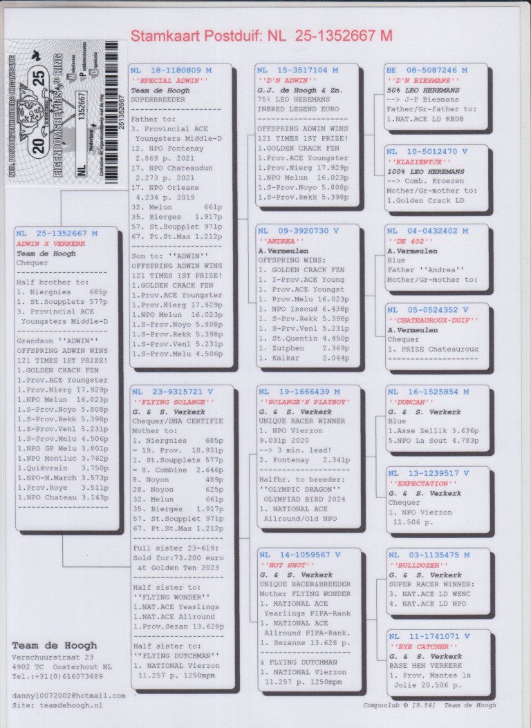 Uit: ”Special Adwin”, vader 3. Prov. Asduif Jonge Duiven Midfond, 12.-17-.17-etc. NPO, zoon ”Adwin” x ”Flying Solange”, moeder 2x 1. Prijs & dochter ”Solange’s Playboy”, 1. NPO Vierzon & ”Hotsot”, moeder 1. Nat. Asduif