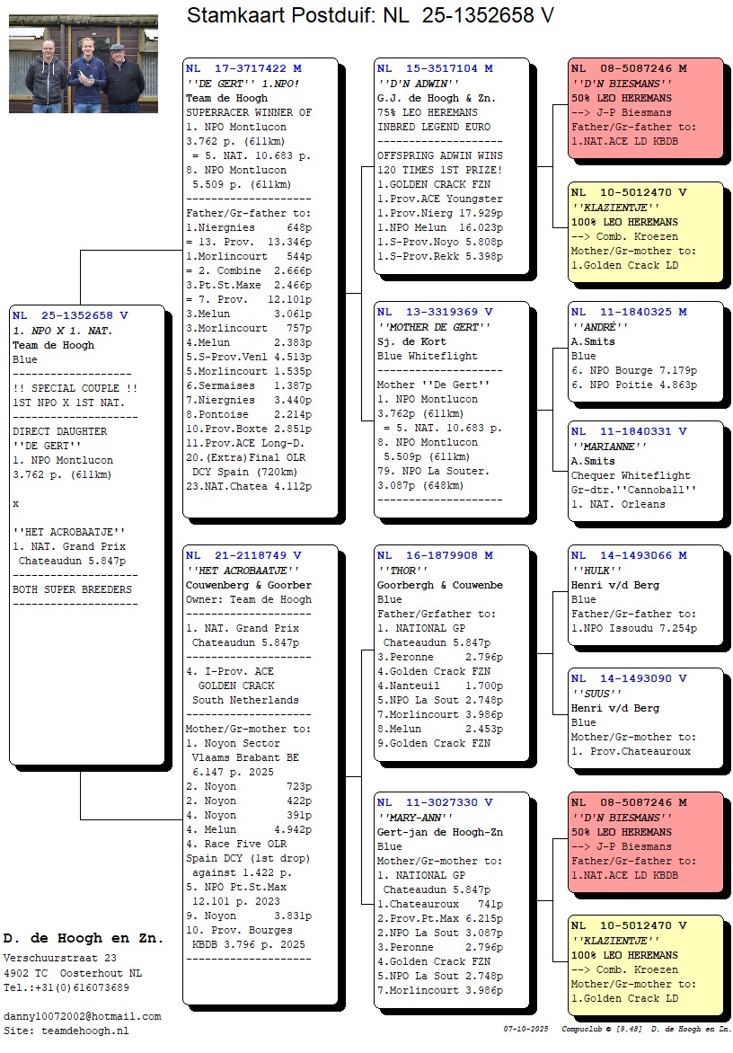 Uit: ”De Gert”, 1. NPO Montlucon 3.762 d., 8. NPO Montlucon 5.509 d., vader 1.-1.-3.-3.-3.-4.-5.-etc. gemiddeld 2.000 d., vader 3. Prov. Gouden Crack 2025 x ”Het Acrobaatje”, 1. Nat. Chateaudun 5.847 d., gr-moeder 1.-6.147 d.