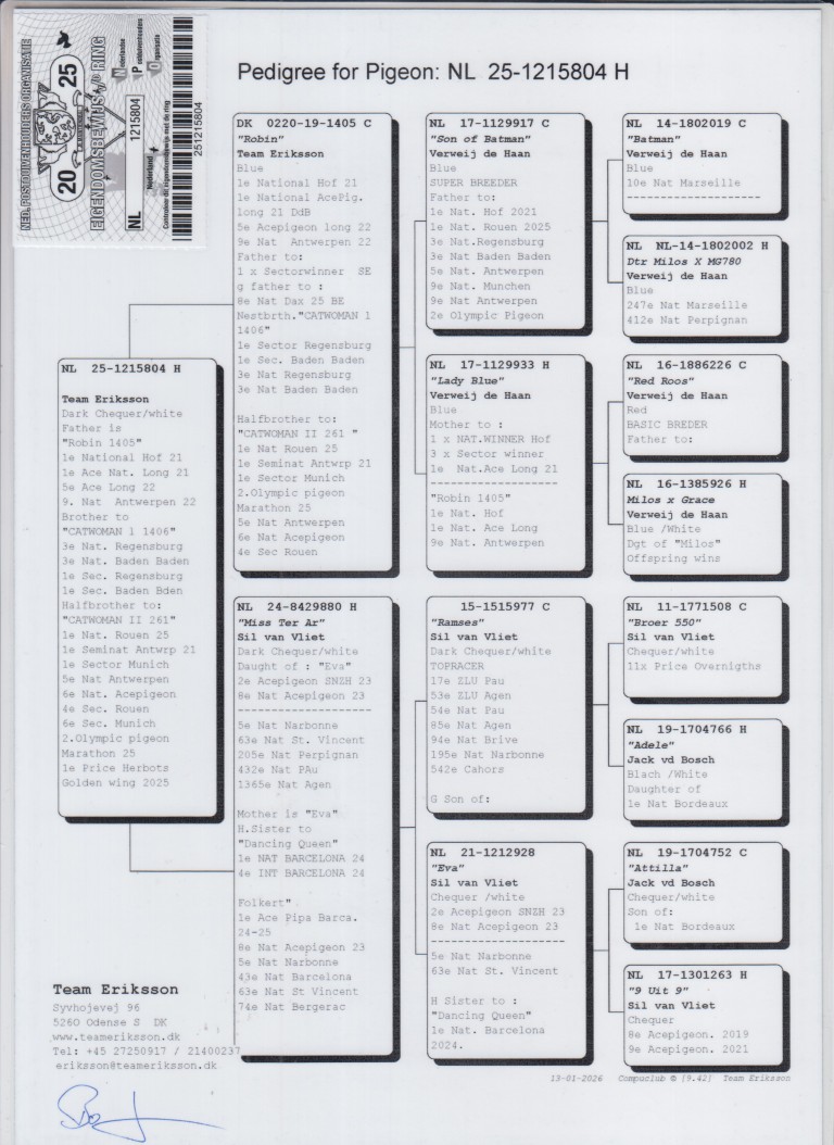 Uit: ”Robin”, 1. Nat. Asduif Marathon 2021, 1. Nat. Hof 2021, 9. Nat. Antwerpen, vader 1. Nat. Sector, gr-vader 8. Nat. Dax BE x ”Miss Ter Aar”, dochter ”Eva”, 2. Inter-Prov. Asduif Int. Vluchten, 5. Nat. Narbonne