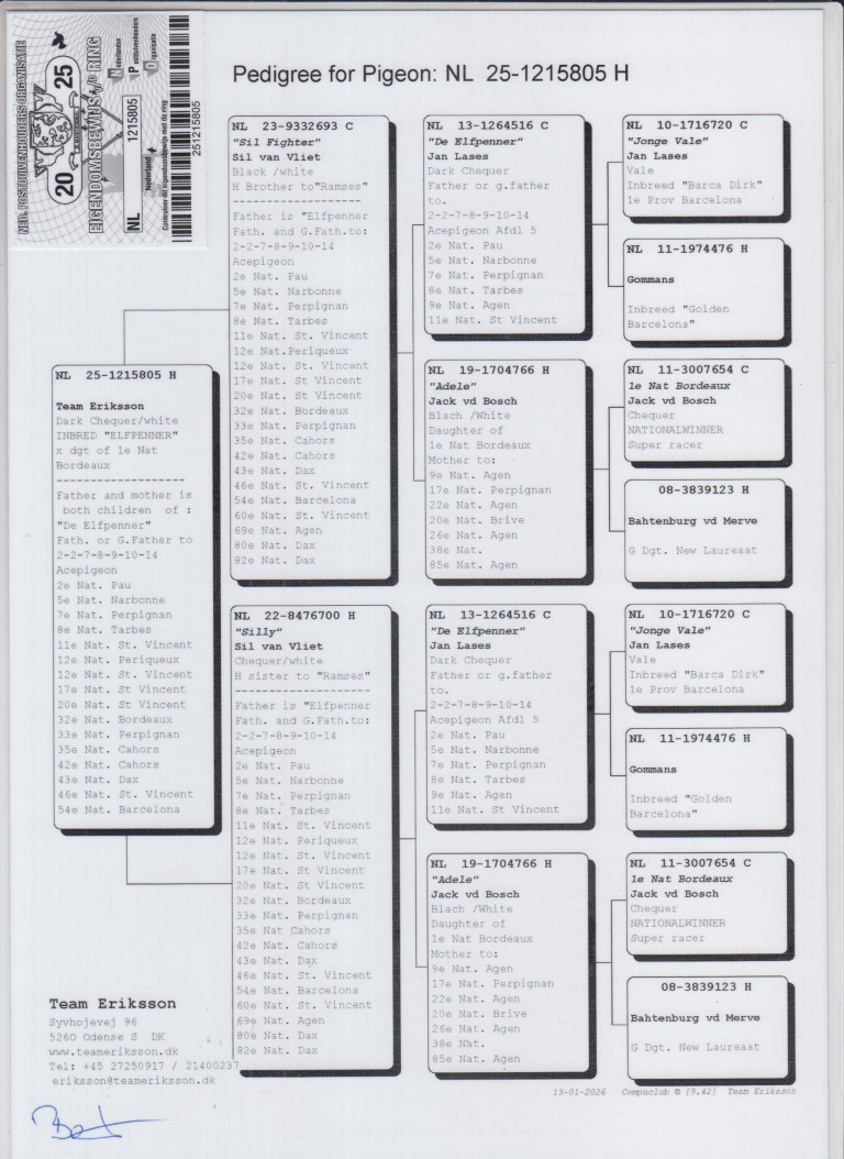 Uit: ”Sil Fighter”, zoon Stamvader ”De Elfpenner” x ”Silly”, dochter Stamvader ”De Elfpenner”, nazaten 6x top 10 Asduif Int. Vluchten, 2. Nat. Pau, 5. Nat. Narbonne, 7. Nat. Perpignan, 8. Nat. Tarbes, 11. Nat. St.Vincent