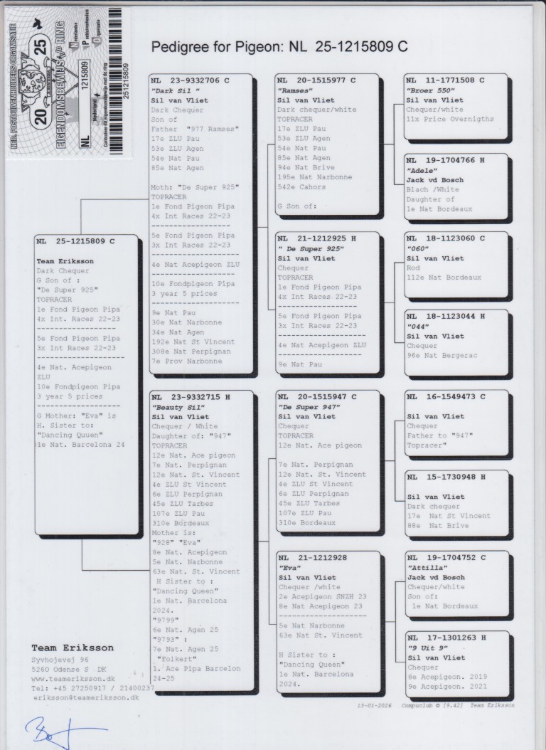 Uit: ”Dark Sil”, zoon ”De Super 925”, 1. Int. Asduif Int. Vluchten 2022/2023, 4. Nat. Asduif Int. Vluchten, 9. Nat. Pau, 30. Nat. Narbonne, 34. Nat. Agen x ”Beauty Sil”, dochter ”De Super 947”, 4. Nat. St.Vincent, 6. Nat. Perpignan