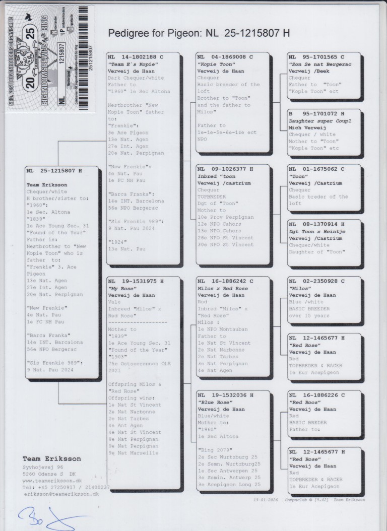 ”De 807”, 1/2 zus 1. Asduif Jonge Duiven, 1. Sec. Altona, uit: ”Team E’s Kopie”, zoon ”Kopie Toon”, Stamduif Verweij-de Haan x ”My Rose”, uit zoon ”Milos” & ”Red Rose”, uit dochter ”Red Rose”, 1. Europese Asduif Int. Vluchten