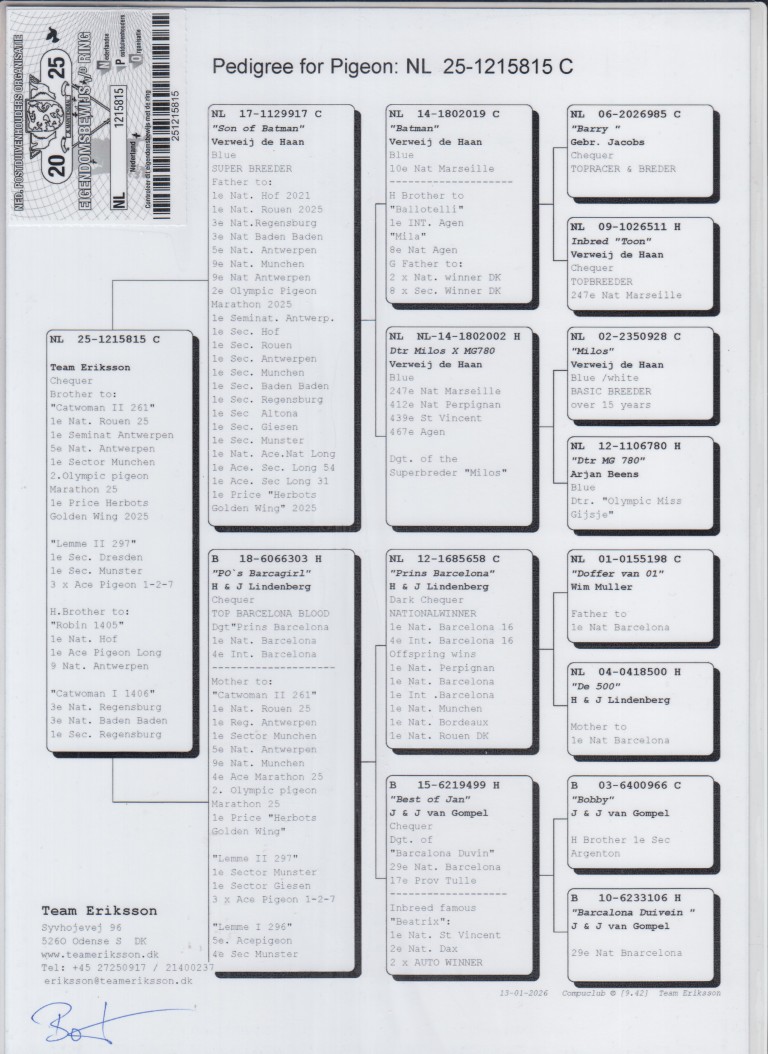 ”De 815”, (1/2) broer 1. Nat. Asduif Marathon 2021, 2. Olympiade duif Marathon 2026, 1. Nat. Hof, 1. Nat. Rouen, 1. Semi-Nat. Antwerpen, 1. Nat. Herbots Golden Wing, uit: ”Son of Batman” x ”PO’s Barcagirl”