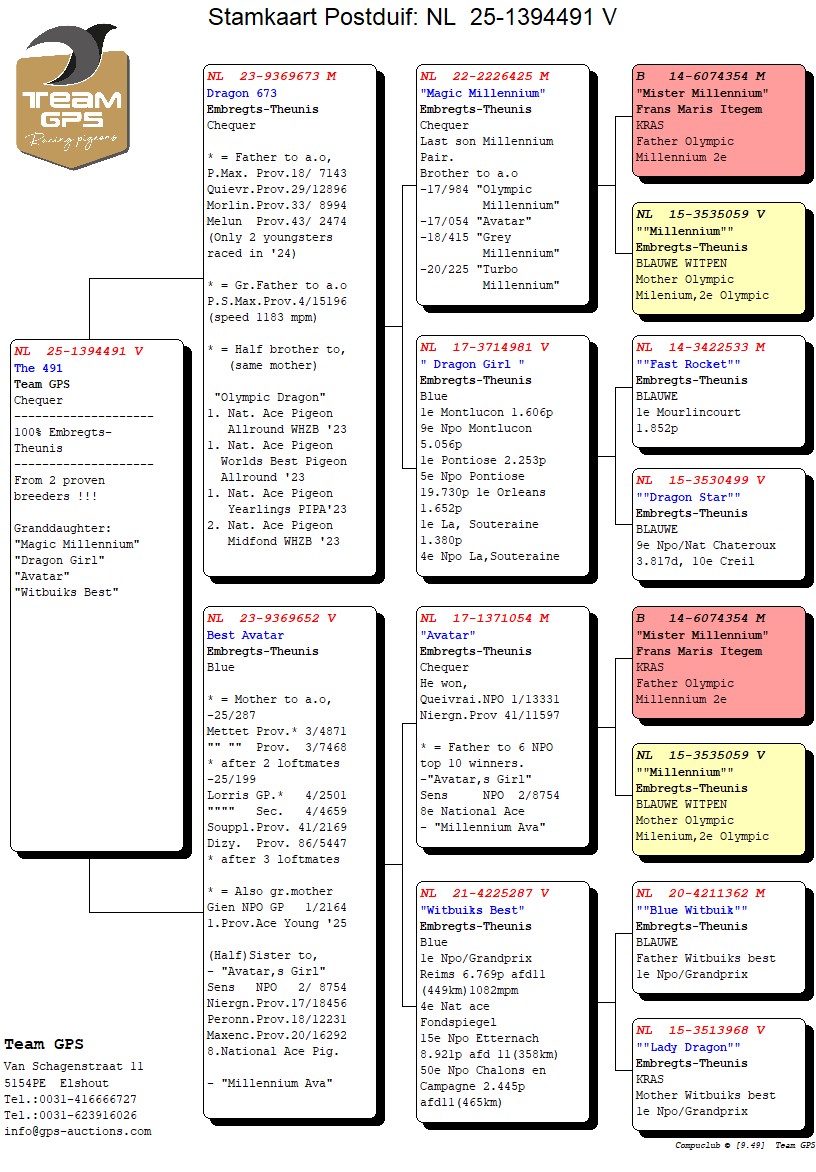 Uit: ”Dragon 673”, gr-vader 4. Prov. 15.196 d., 1/2 broer ”Olympic Dragon” x ”Best Avatar”, moeder 3. Prov. 7.468 d. (Achter 2 hokgenoten), 4. Nat. 4.659 d. (Achter 3 hokgenoten), gr-moeder 1. NPO 2.164 d., 1. Prov. Asduif Jonge 2025