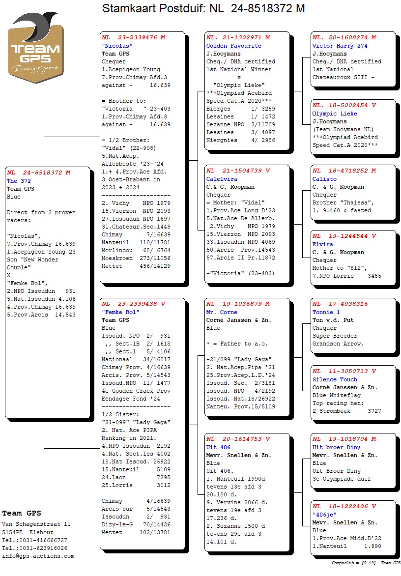 Uit: ”Nicolas”, 1. Asduif Jonge Duiven, 7. Prov. 16.639 d., zoon Topkoppel, broer ”Victoria”, 2x 1. NPO/Prov. x ”Femke Bol”, 4. Prov. 16.639 d., 4. Prov. Asduif Gouden Crack, 5. Prov. 14.543 d., 5. Nat. 4.106 d., 11. NPO 1.477 d.