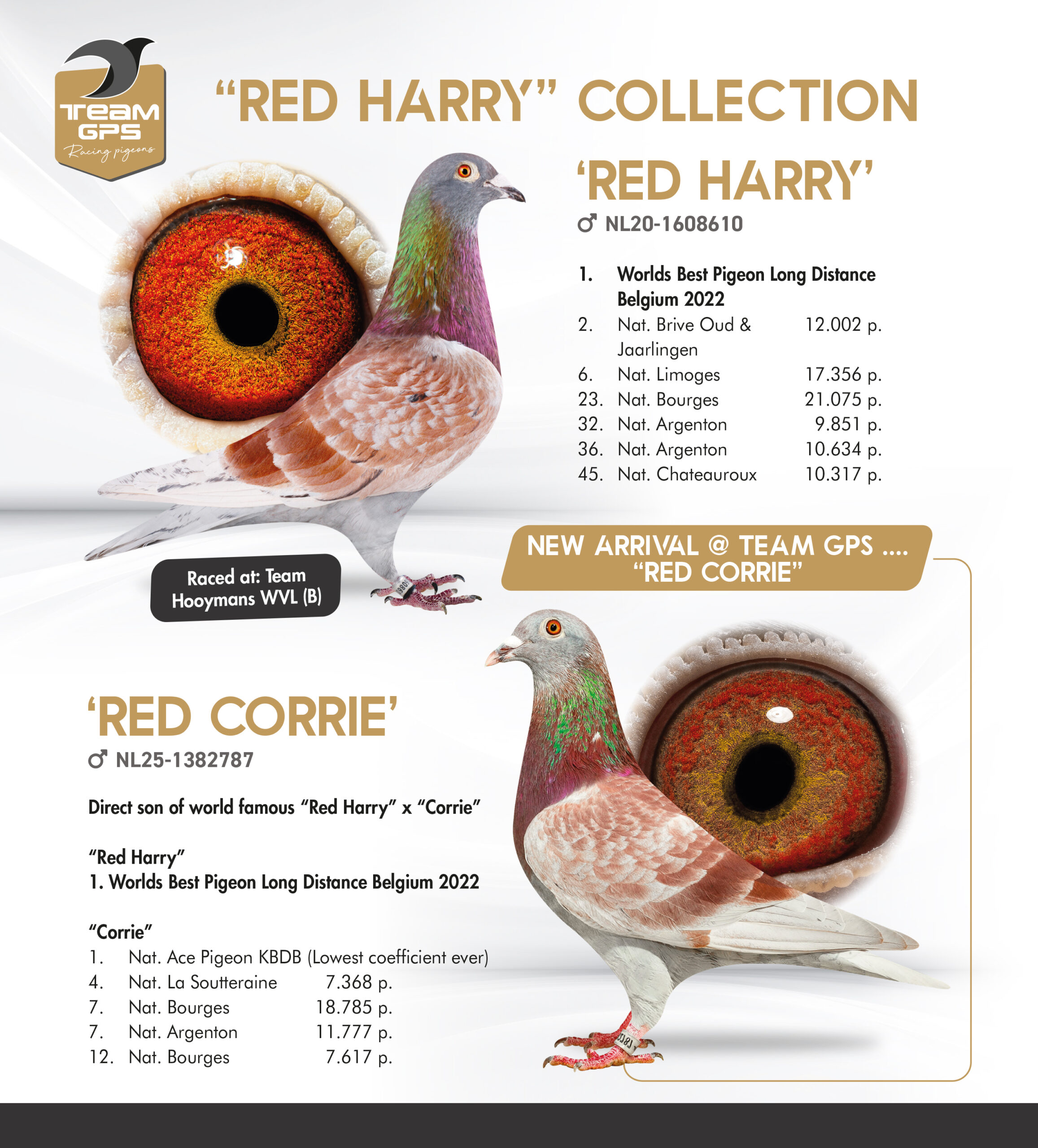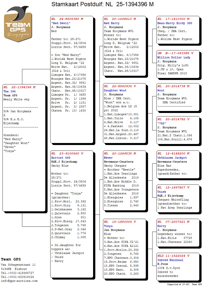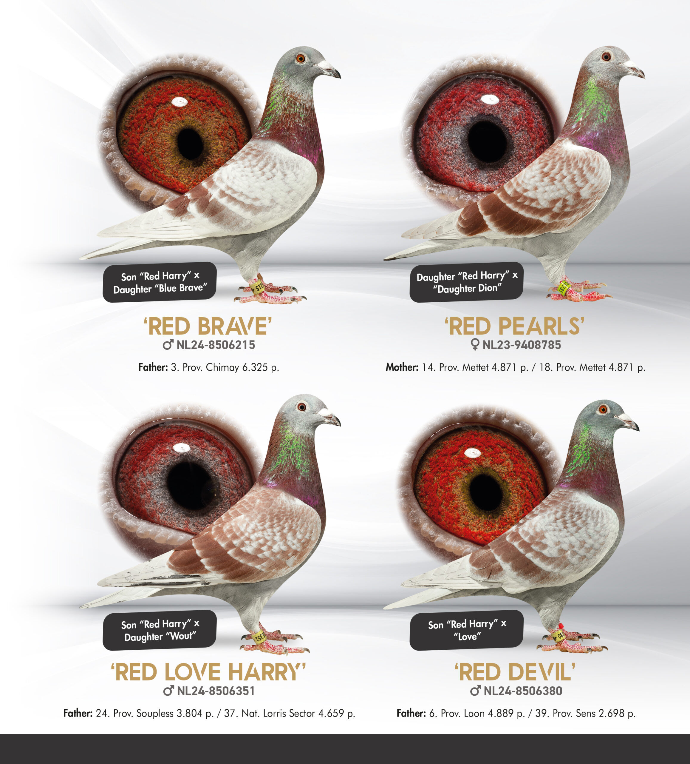 Uit: ”Red Devil”, vader 24. Prov. 3.804 d., zoon ”Red Harry”, 1. Nat. Asduif Fond FCI x ”Harriet 660”, moeder 24. Prov. 3.804 d., 1/2 zus 3. & 4. Nat. Asduif, uit zoon ”Vetblauwe Jackpot”, uit dochter ”Harry”, 1. Nat. Asduif