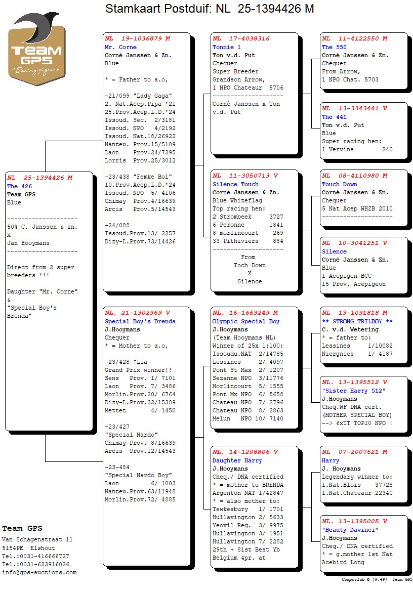 Uit: ”Mr. Corné”, vader 2. Nat. Asduif Jonge Duiven, 2. Nat. 3.181 d., 4. NPO 2.192 d., 4. Prov. 16.639 d., 5. Prov. 14.453 d., 5. NPO 4.106 d. x ”Special Boy’s Brenda”, moeder 1. NPO GP 7.101 d., 7. Prov. 3.486 d., 8. Prov. 16.639 d.