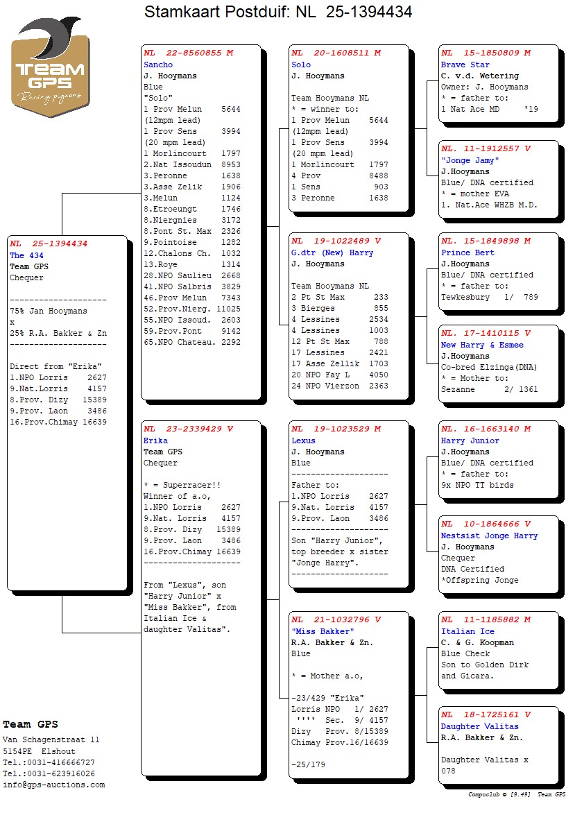 Uit: ”Sancho”, zoon ”Solo”, 1. Prov. 5.644 d., 1. Prov. 3.994 d. x ”Erika”, 1. NPO Lorris 2.627 d., 8. Prov. 15.389 d., 9. Nat. 4.157 d., 9. Prov. 3.486 d., 16. Prov. 16.639 d., uit zoon ”Harry Junior”, vader 9x top 10 NPO!