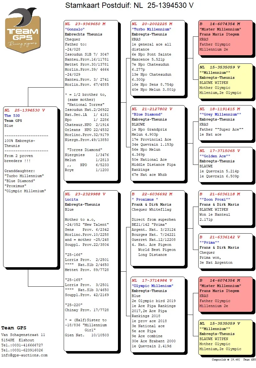 Uit: ”Gonzalo”, vader 3. Prov. 2.741 d., 7. Nat. 3.047 d., 1/2 broer ”National Torres”, 1. Nat. 4.181 d. x ”Lucita”, moeder 2. & 3. Nat. Lorris 4.650 d. (Achter hokgenoot), 6. Prov. 2.342 d., 10.-2.258 d., dtr. ”Olympic Millenium”