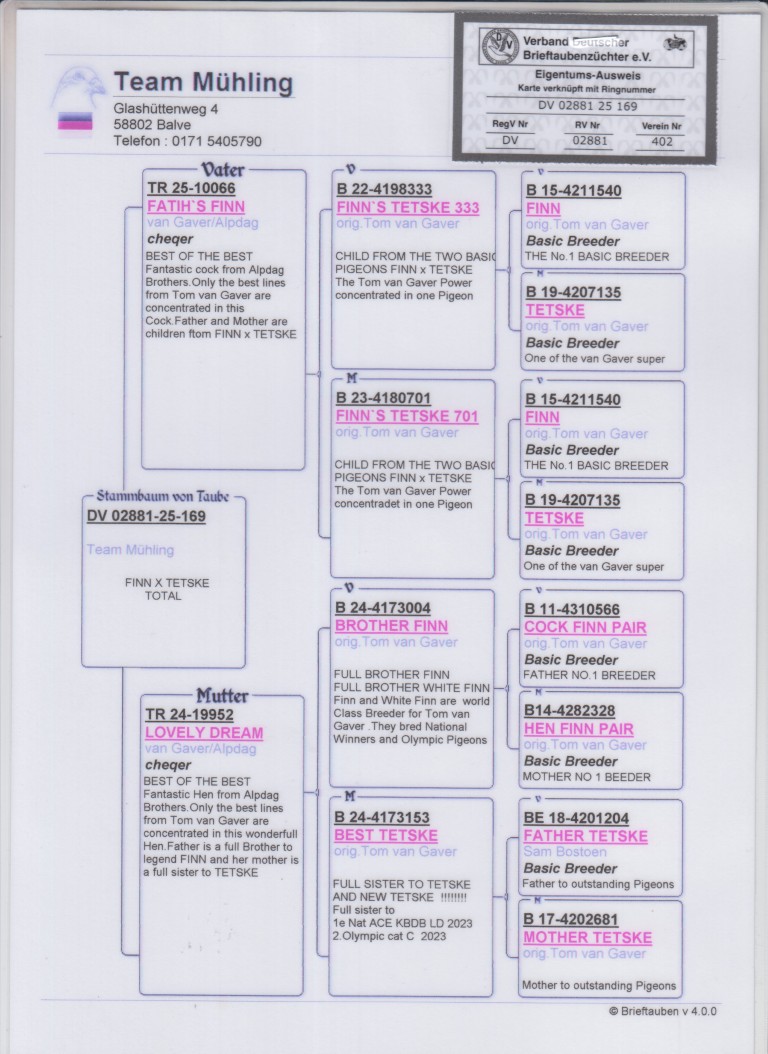 Uit: ”Fatih’s Finn”, uit zoon & dochter ”Finn” & ”Tetske”, 1. Nat. Brive 7.994 d., 1. Prov. Orleans, 1. Prov. Blois x ”Lovely Dream”, uit broer ”Finn”, Stamvader Tom van Gaver, uit zus ”Tetske”, Stammoeder Tom van Gaver