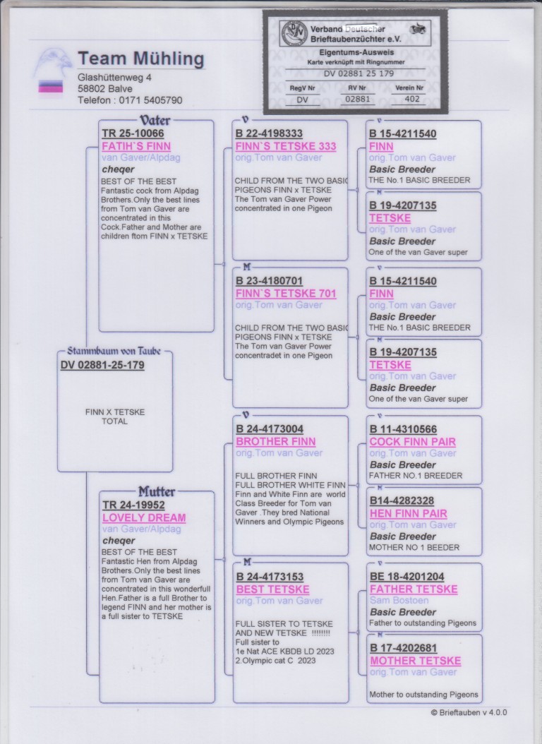 Uit: ”Fatih’s Finn”, uit zoon & dochter ”Finn” & ”Tetske”, 1. Nat. Brive 7.994 d., 1. Prov. Orleans, 1. Prov. Blois x ”Lovely Dream”, uit broer ”Finn”, Stamvader Tom van Gaver, uit zus ”Tetske”, Stammoeder Tom van Gaver
