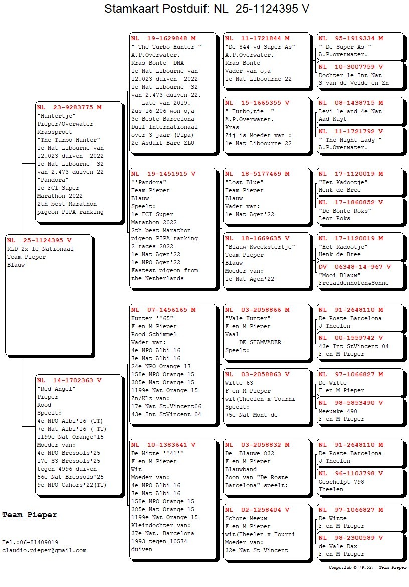 Uit: ”Huntertje”, zoon ”Turbo Hunter”, 1. Nat. Libourne 12.023 d., zoon ”Pandora”, 1. Nat. Asduif Marathon FCI, 1. Nat. Agen x ”Red Angel”, 4. NPO Albi, 7. Nat. Albi, moeder 4. NPO Bressols, 9. NPO Cahors, 17. Nat. Bressols