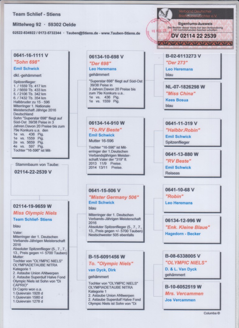 Uit: ”Sohn 698”, 1.-1.559 d., 2.-5.659 d., 5.-2.106 d., 6.-7.432 d., 1/2 broer ”De 596”, Mede-winnaar 1. Nat. Kampioen Duitsland x ”Miss Olympic Niels”, uit dochter ”Olympic Niels”, Olympiade duif, gr-vader meerdere 1. Nat. Asduif