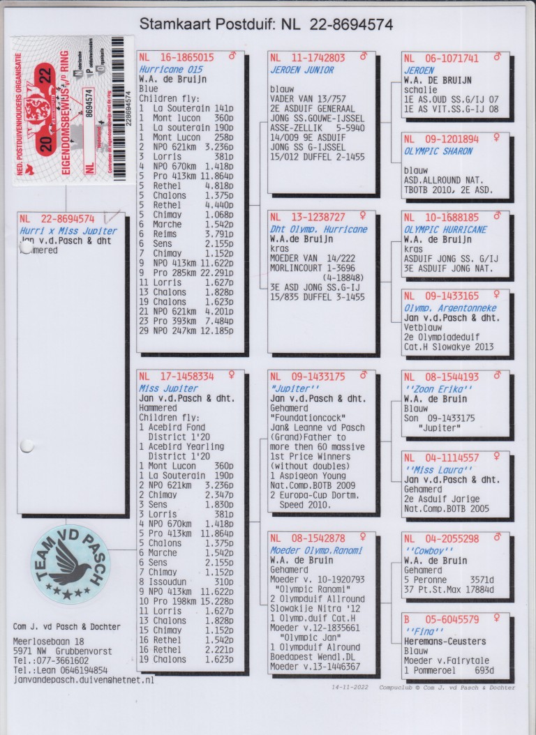 Hij komt uit: NL08-1544193. Zoon ‘Erika’, W.A. de Bruin