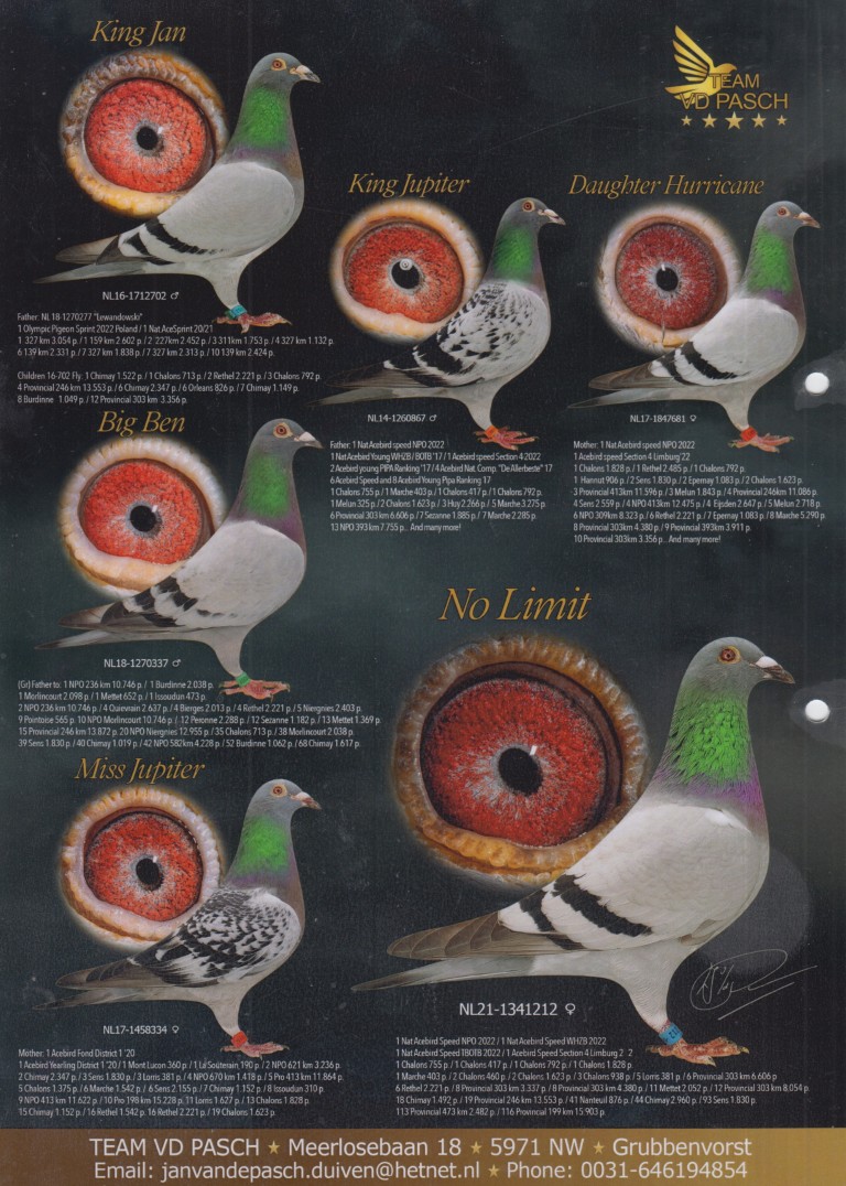 (1/2) zus 1. Asduif Jaarlingen, 1. Asduif Dagfond, 2. NPO Montlucon 3.236 d., 2.-2.347 d., 3.-1.830 d., 4. NPO 1.418 d., 5. Prov. 11.864 d., 5.-1.375 d., 6.-2.155 d., 6.-1.542 d., uit: ”Hurricane 015” x ”Miss Jupiter”, dochter ”Jupiter”