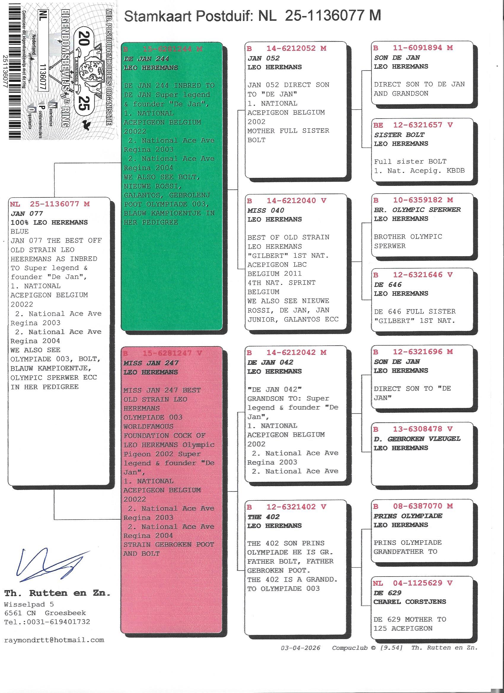 Uit: ”De Jan 244”, Leo Heremans, inteelt ”De Jan”, 1. Nat. Asduif, lijn ”Olympic Sperwer”, Olympiade & ”Bolt”, 1. Nat. Asduif x ”Miss Jan 247”, Leo Heremans, lijn ”De Jan”, 1. Nat. Asduif, lijn ”Olympiade 003”