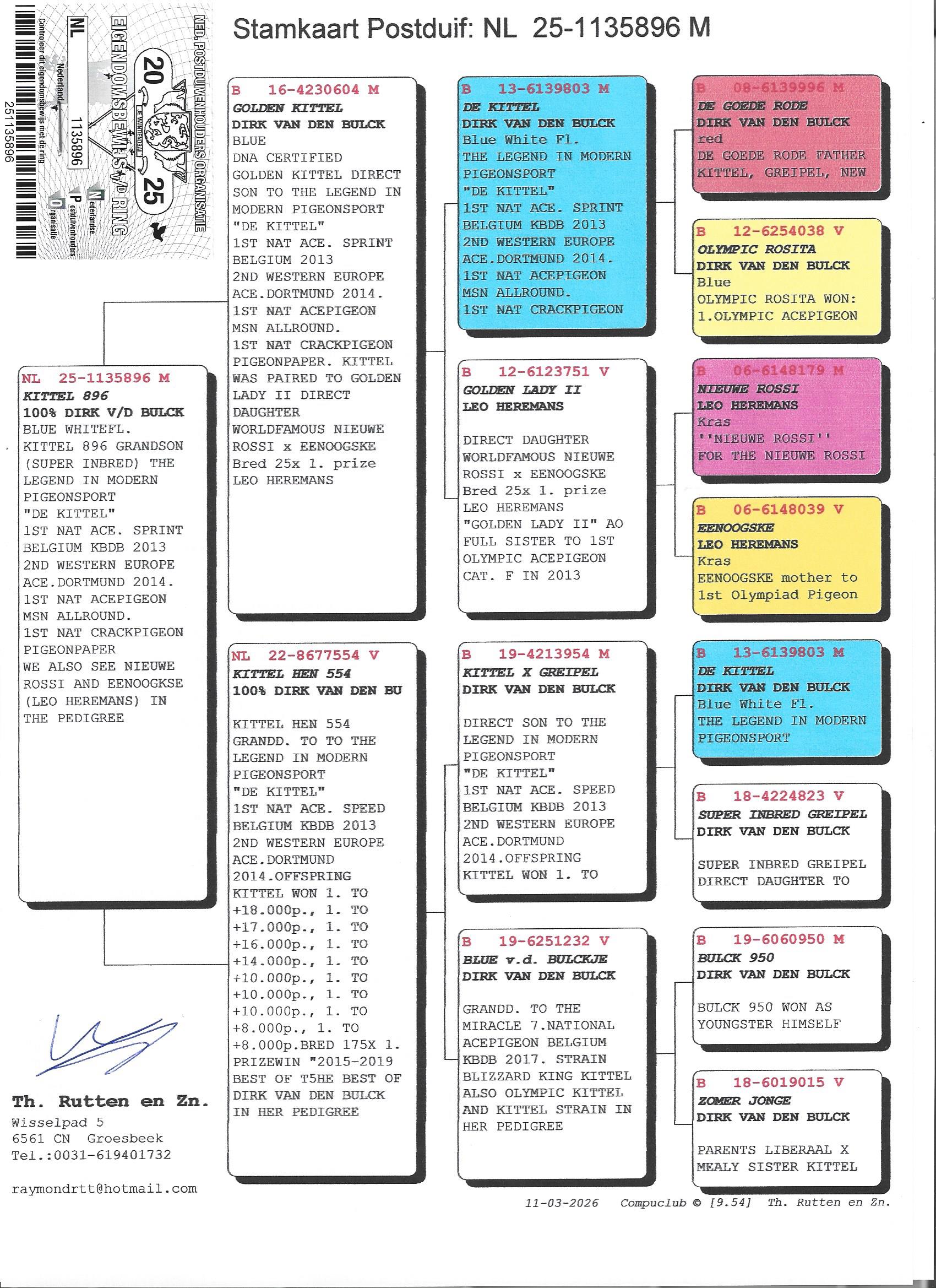 Uit: ”Golden Kittel”, zoon ”Kittel”, 1. Nat. Asduif Sprint KBDB & legendarische kweker, uit zoon ”Olympic Rosita” x ”Kittel Hen 554”, uit zoon ”Kittel”, 1. Nat. Asduif Sprint KBDB & legendarische kweker