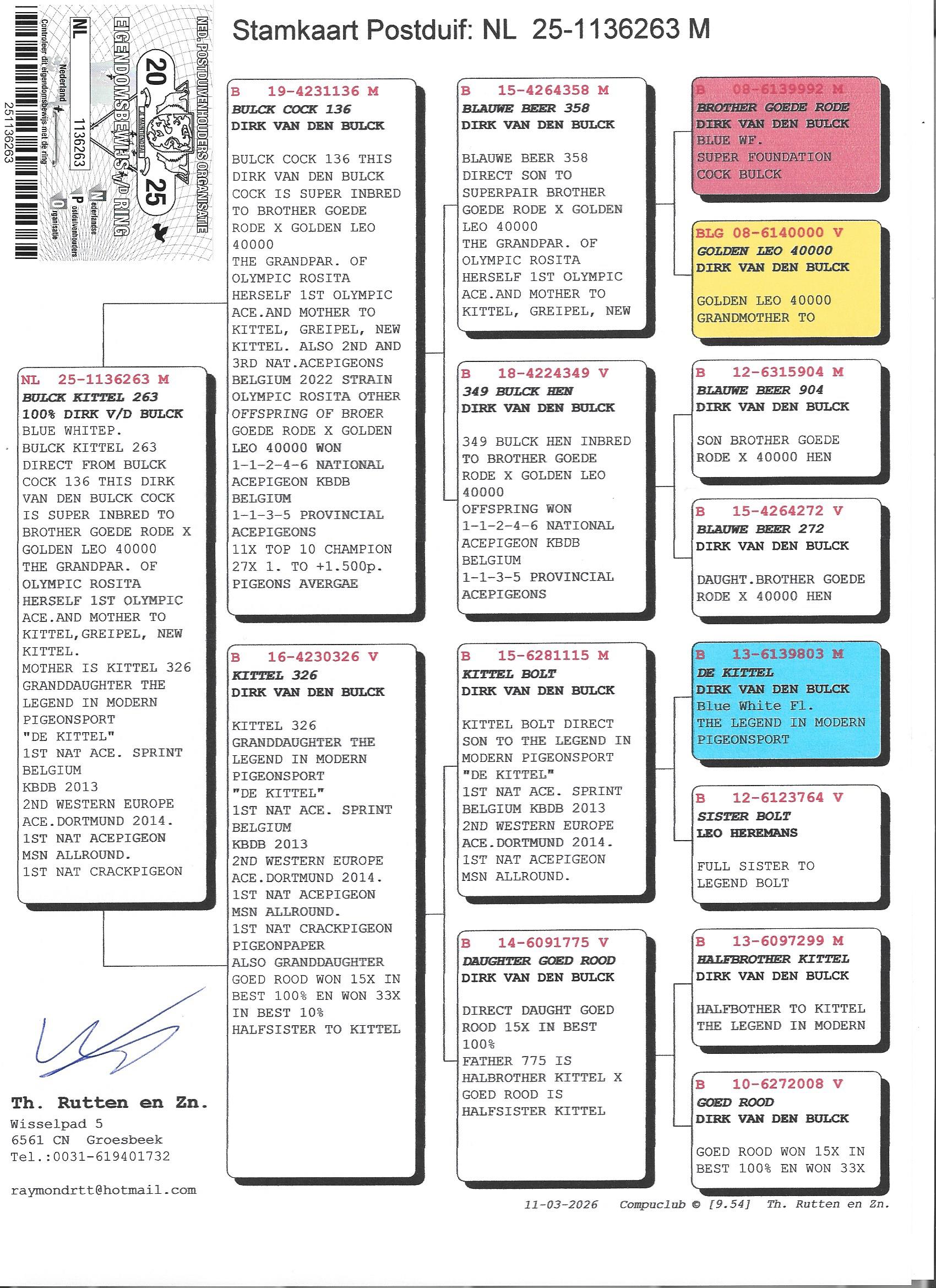 Uit: ”Bulck Cock 136”, Dirk van den Bulck, uit zoon ”Broer Goede Rode” & ”Golden Leo 40000” x ”Kittel 326”, Dirk van den Bulck, uit zoon ”Kittel”, 1. Nat. Asduif Sprint KBDB & legendarische kweker