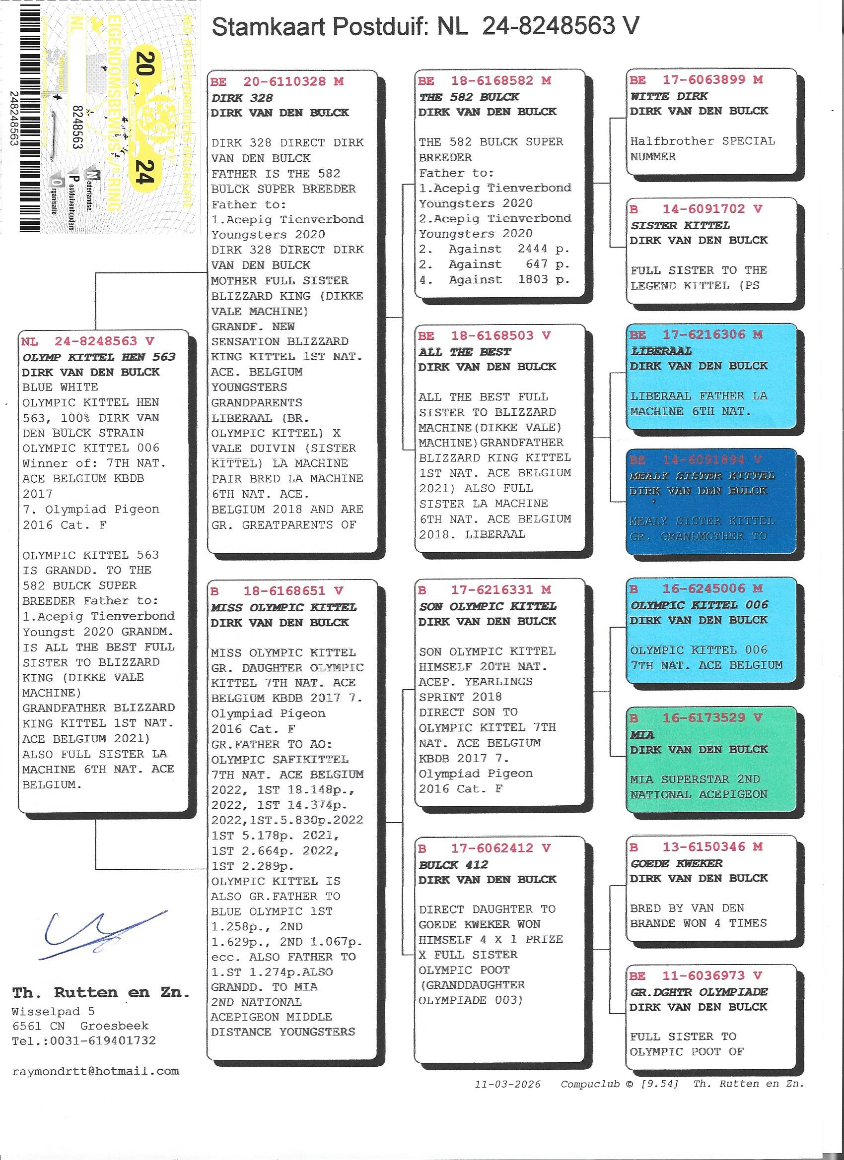 Uit: ”Dirk 328”, 1/2 broer 1. & 2. Asduif Jonge Duiven Tienverbond, lijn ”Blizzard King Kittel” x ”Miss Olympic Kittel”, uit zoon ”Olympic Kittel 006”, Olympiade duif Cat. F, 7. Nat. Asduif KBDB, lijn ”Kittel”