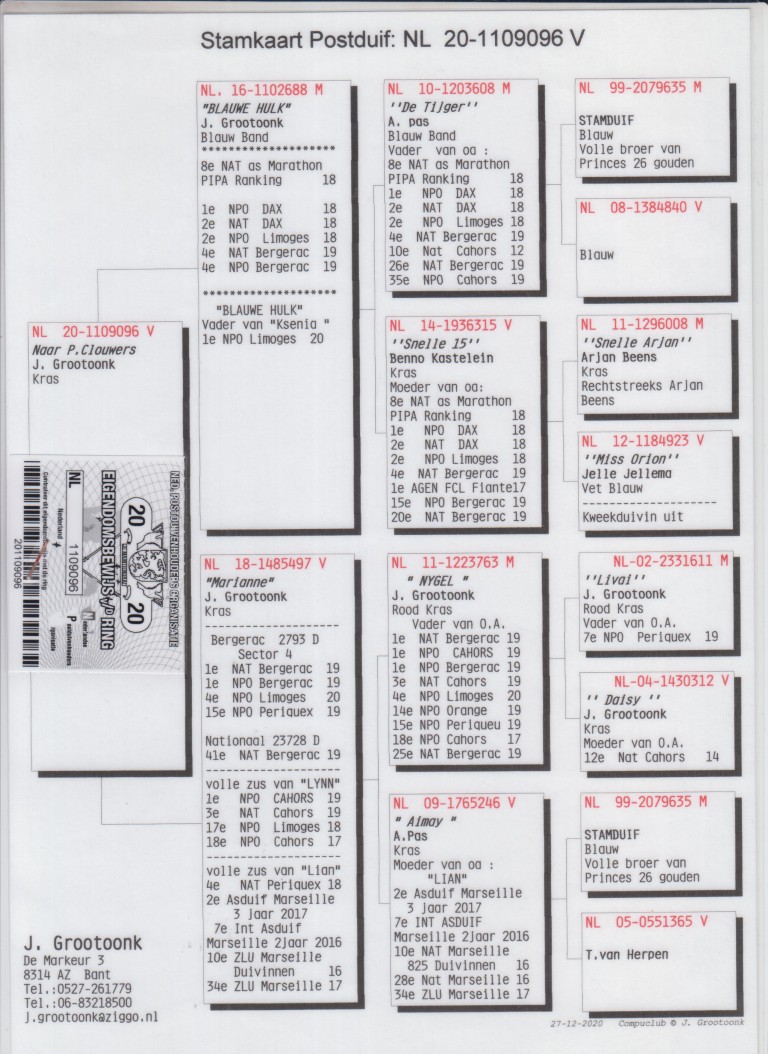 Uit: ”Blauwe Hulk”, 1. NPO Dax, 2. Nat. Dax, 2. NPO Limoges, 4. Nat. Bergerac, 8. Nat. Asduif Marathon PIPA x ”Marianne”, 1. Nat. Bergerac 2.793 d., 1. NPO Bergerac, 4. NPO Limoges, 15. NPO Perigueux, dochter ”Nygel”