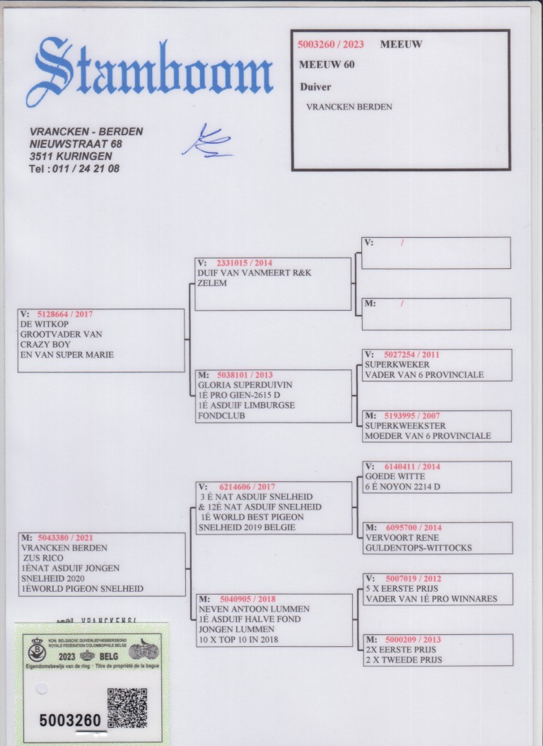 Grootvader: 14-2331015. Duif van R. & K. Van Meert, Zelem.