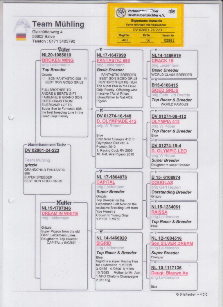 Uit: ”Broken Wing”, zoon ”Son Goed Grijs 998”, gr-vader 1. Nat. Asduif Midfond NPO & 21x 1. Prijs x ”Dream in White”, uit zoon Superkweker & vlieger ”Raissa”, 1. Reserve Olympiade duif, dochter ”Sigrid”, 1.-10.739 d.
