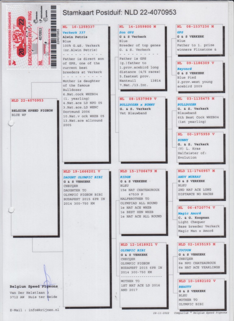Uit: ”Verkerk 337”, uit dochter ”Bulldozer”, 3.-4.-6.-10.-13. Nat. Asduif, uit zoon ”GPS” & ”Beyonce” x ”Daughter Olympic Bibi”, dochter ”Olympic Bibi”, Olympiade duif, uit zoon ”Andy Murray” & ”Magic Amoré”
