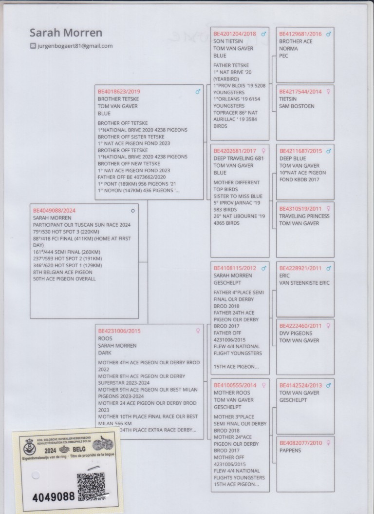 Uit: ”Brother Tetske”, broer ”Tetske”, 1. Nat. Brive, 1. Prov. Blois, 1. Prov. Orleans, ”New Tetske”, 1. Nat. Asduif KBDB x ”Roos”, 50% Tom van Gaver