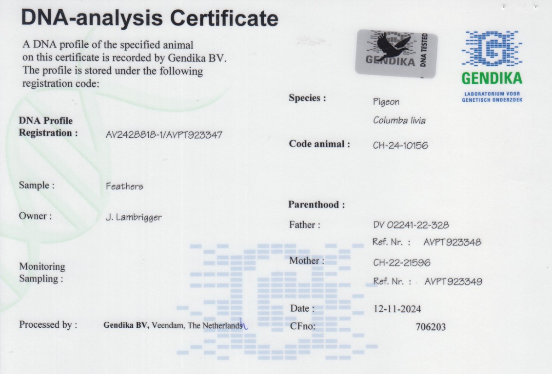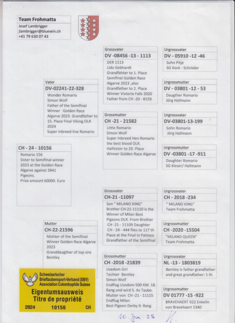 Moeder van CH-21-11115 eindvlucht Milan Beste duif Derby. 9. Rang.