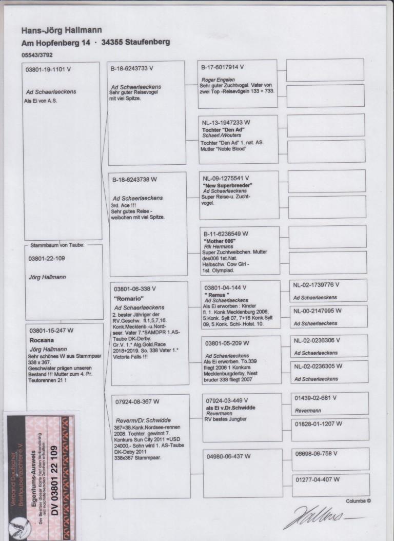 Uit: ”De 1101”, zoon ”De 738”, 3. Asduif & uit 1/2 zus ”Cow Girl”, 1. Olympiade duif, uit klz. ”Den Ad” x ”Rocsana”, dtr. ”Romario”, Unieke topkweker, nazaten winnen: 3x 1. Finale OLR Golden Algarve, 1. Finale OLR Victoria Falls