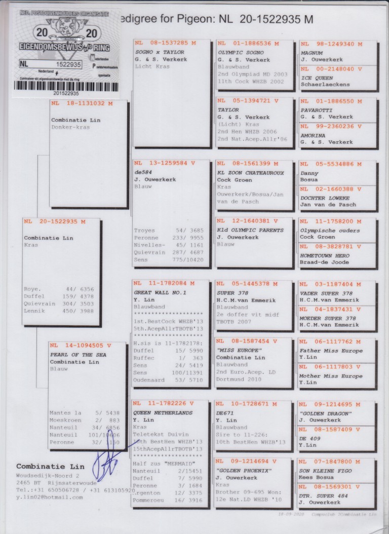”De 935”, 44.-6.356 d., 159.-4.378 d., 304.-3.503 d., 450.-3.988 d., uit: ”De 032”, uit zoon ”Olympic Sogno”, 2. Olympiade duif bij Verkerk x ”Pearl of the Sea”, 2.-883 d., 5.-5.438 d., dochter ”Great Wall No.1”, 1. Nat. Asduif