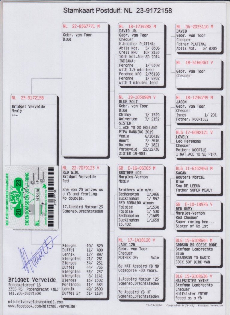 Uit: ”De 771”, zoon ”Blue Bolt”, 1.-1.529 d., 3.-2.152 d. x ”Red Girl”, 17. Asduif Natour CC, 8.-1.141 d., 10.-829 d., 11.-683 d., 11.-400 d., 13.-1.302 d., 17.-897 d., 21.-281 d., 31.-1.184 d., 34.-251 d., 44.-766 d., 49.-2.600 d., 53.-257 d.