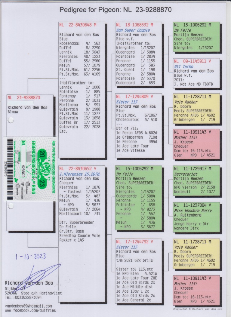 Uit: ”De 648”, 4.-563 d., 8.-2.290 d., 18.-3.643 d., 1/2 broer 1.-1.006 d., 1.-885 d., 1.-517 d., 2.-1.031 d. x ”1. Niergnies 15.207 d.”, 1. Niergnies 15.207 d., 5. NPO Melun 5.677 d., 5. Pt.St.Max. 487 d., 7. Quiévrain 2.064 d., dtr. ”Felle”