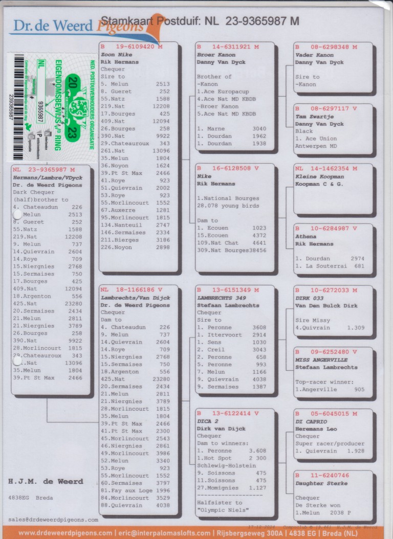 Uit: ”Zoon Nike”, vader 5.-2.513 d., 8.-252 d., 35.-1.804 d., 36.-1.624 d., 39.-2.466 d., zoon ”Nike”, 1. Nat. Bourges 28.078 d. x ”Lambrechts/van Dyck”, moeder 4.-226 d., 9.-737 d., 14.-2.604 d., 14.-709 d., 15.-2.768 d.