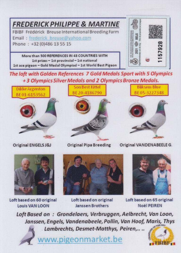 Hij komt uit BE16-4051832. Vader “Daniel”. Topkweker en vlieger.
