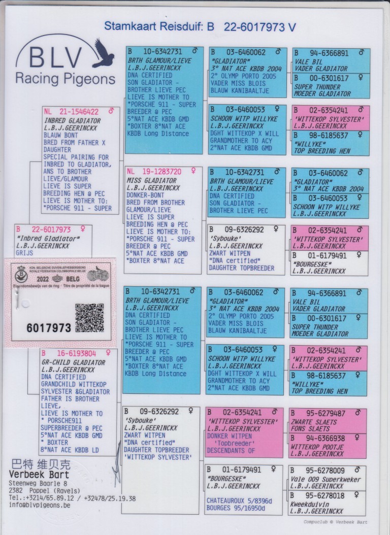 Uit: ”Inbred Gladiator”, inteelt ”Gladiator”, 2. Olympiade duif Cat. Sprint, 3. Nat. Asduif Kleine Halve Fond KBDB 2004 x ”Gr-child Gladiator”, inteelt ”Gladiator”, 2. Olympiade duif Cat. Sprint, 3. Nat. Asduif KBDB